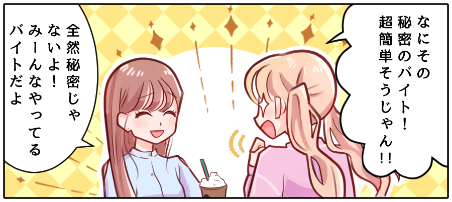 他のバイトみたいにシフトが決まってないし、授業とかテストに合わせて調整できるから両立しやすいです!バレないようにがんばりますw